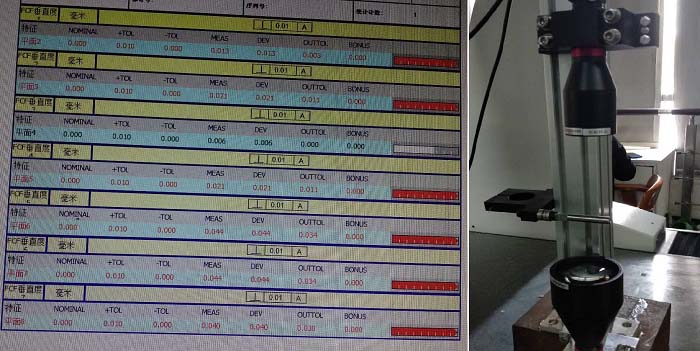 盡管安裝期間遭遇了新冠疫情的突襲,致使很多工作無法按照預(yù)期的計(jì)劃執(zhí)行,但對于機(jī)械結(jié)構(gòu)部分的要求依舊十分嚴(yán)格,設(shè)備安裝過程中,安裝精度也力求達(dá)到最小的偏差值。于是在每一組相機(jī)及鏡頭在安裝至設(shè)備之前,都需要使用高精度三坐標(biāo)檢測設(shè)備做相應(yīng)的尺寸檢測,精度都確保在0.015mm以內(nèi)。下圖為其中一組相機(jī)的安裝數(shù)據(jù)檢測。