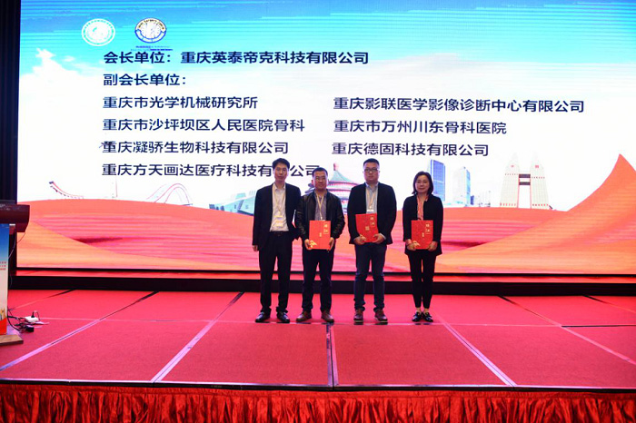 大會執(zhí)行主席、陸軍軍醫(yī)大學(xué)西南醫(yī)院關(guān)節(jié)外科副主任王富友醫(yī)師和副主任陳光興醫(yī)師主持開幕式并致辭。協(xié)會副理事長重慶市光學(xué)機(jī)械研究所所長吳先哲代表重慶市增材制造協(xié)會宣讀第二屆醫(yī)學(xué)分會各項職務(wù)的任命:市光機(jī)所控股企業(yè)重慶英泰帝克科技有限公司被任命為會長單位,英泰帝克何鵬總經(jīng)理擔(dān)任協(xié)會副會長,譚才華部長擔(dān)任協(xié)會副秘書長;市光機(jī)所被任命為分會副會長單位,由市光機(jī)所黨委書記段自力領(lǐng)取分會副會長單位證書。