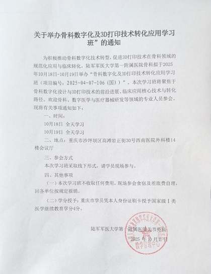 我司參與的國家重點(diǎn)研發(fā)計(jì)劃項(xiàng)目“個(gè)性化多孔鉭植入假體粉床電子束增材制造關(guān)鍵技術(shù)和臨床應(yīng)用”牽頭單位西南醫(yī)院關(guān)節(jié)外科定于2025年10月18-19日舉辦國家級(jí)繼續(xù)醫(yī)學(xué)教育項(xiàng)目“骨科數(shù)字化及3D打印技術(shù)轉(zhuǎn)化應(yīng)用學(xué)習(xí)班”。誠邀相關(guān)技術(shù)人員及業(yè)界同仁積極參加此次培訓(xùn)活動(dòng)。培訓(xùn)班具體安排如下: